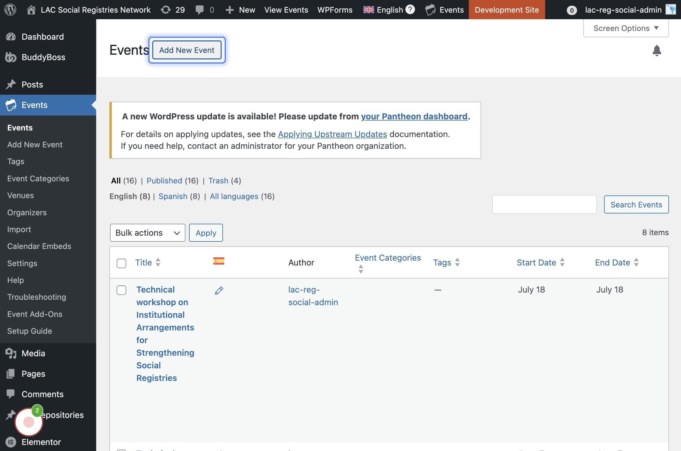 Ir al módulo de gestión del eventos y agregar un nuevo evento: Hacer click en "Events", luego hacer click en "Add New Event"