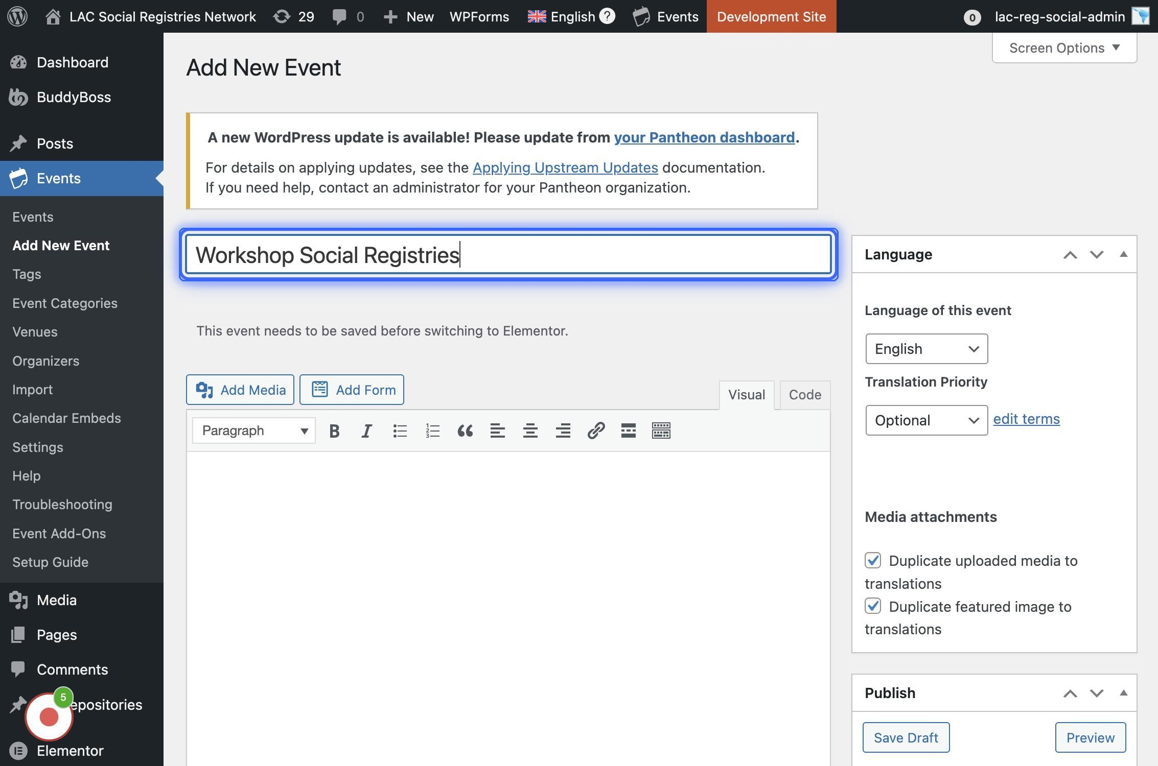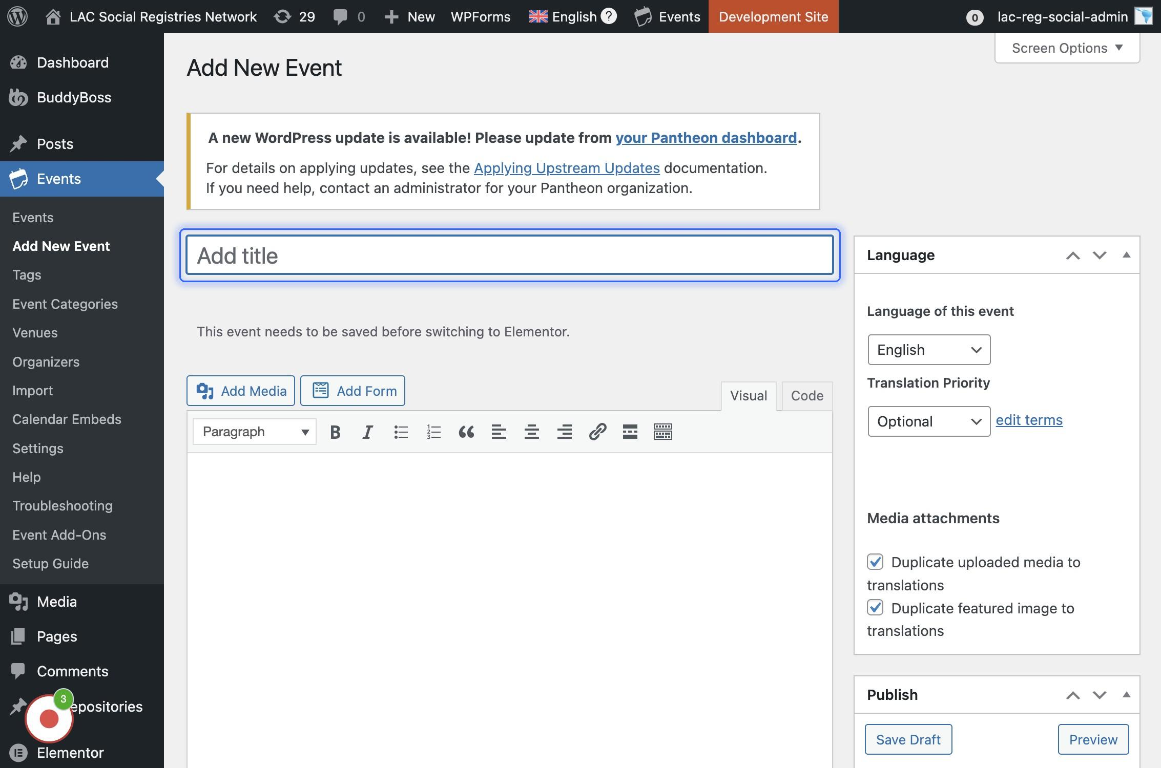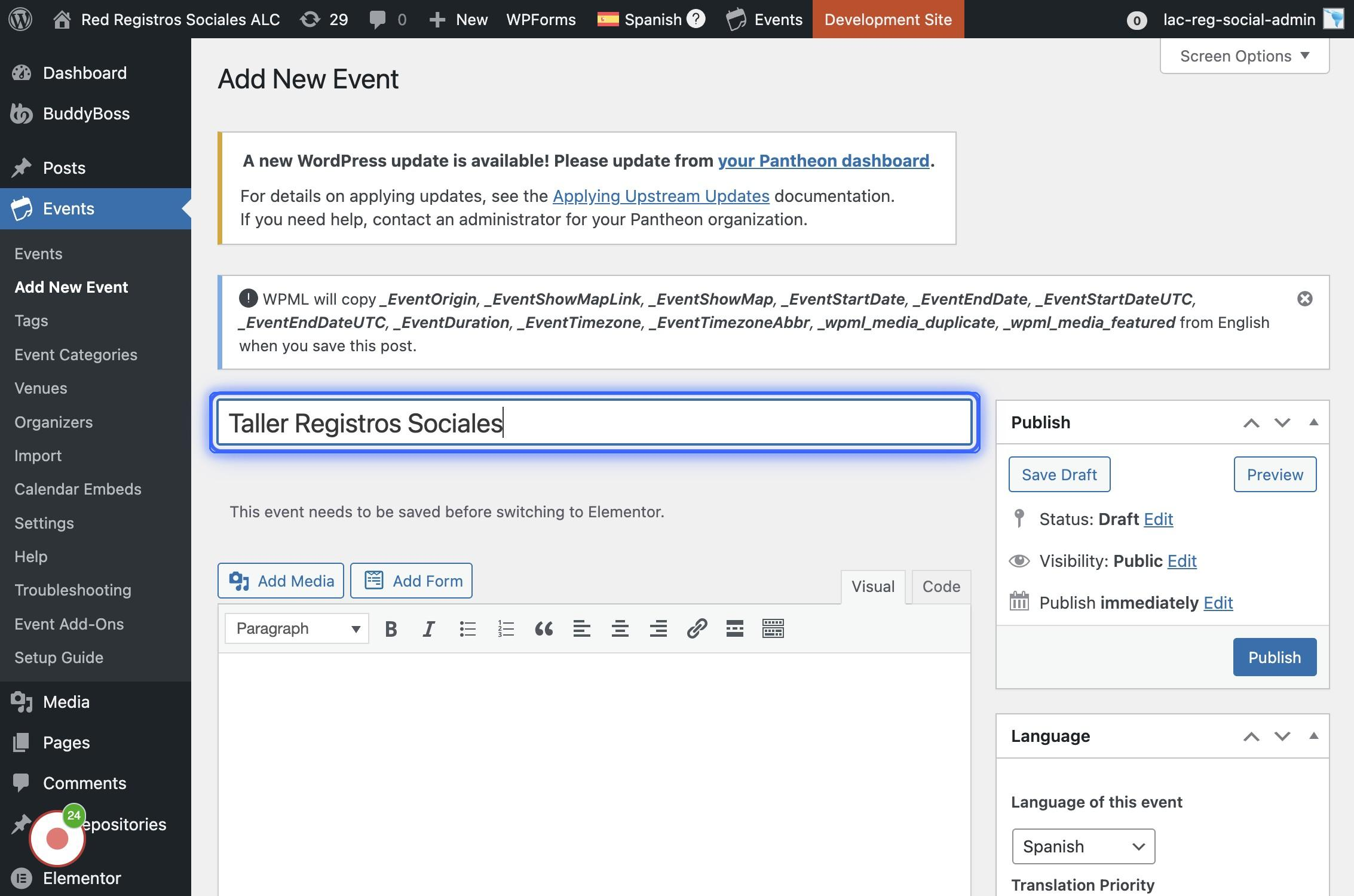 Si se encuentra navegando en la versión en inglés (arriba se visualiza la bandera británica y dice "English") Agregar el título del evento en inglés inicialmente, luego se va a crear la traducción.