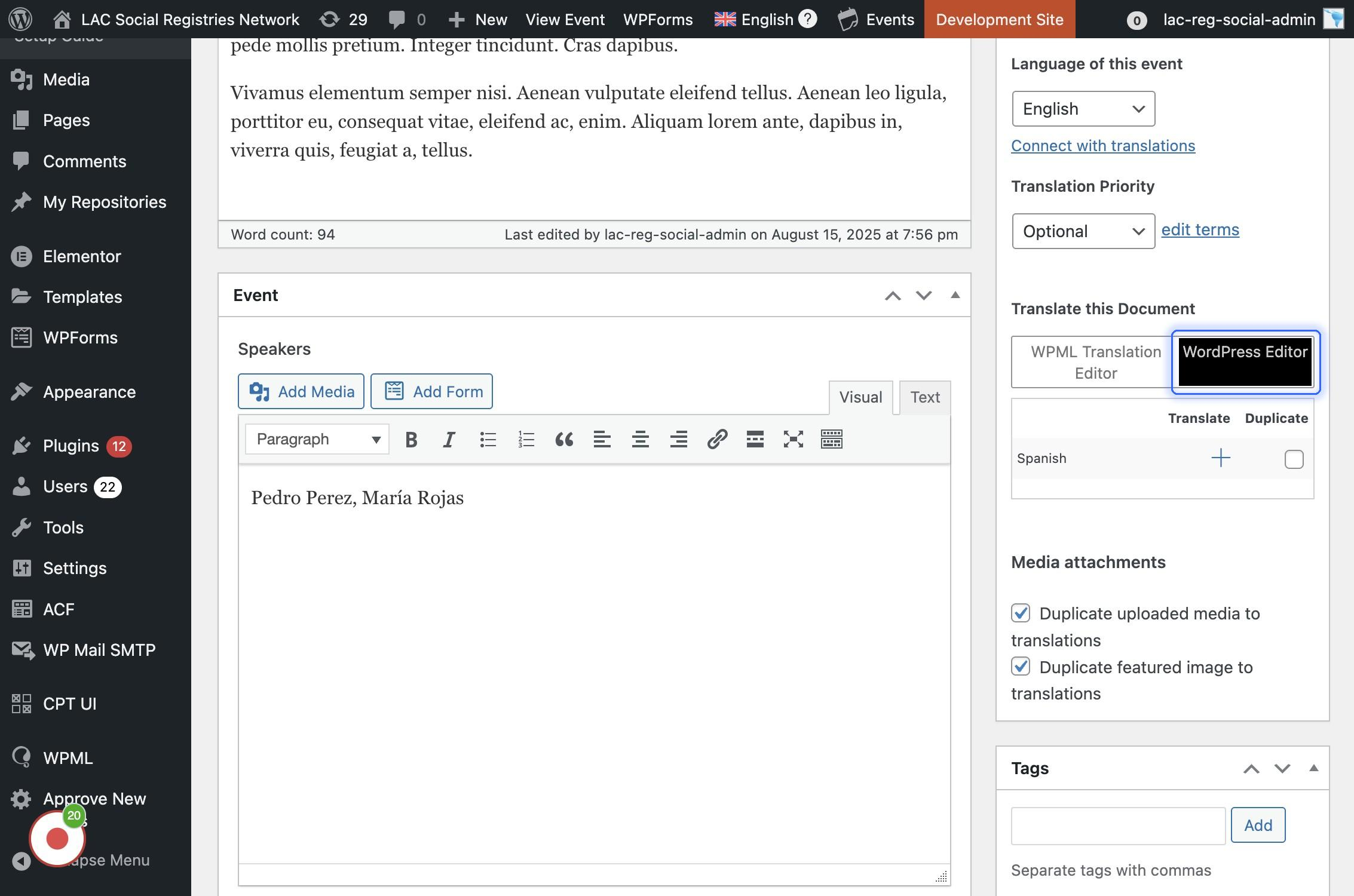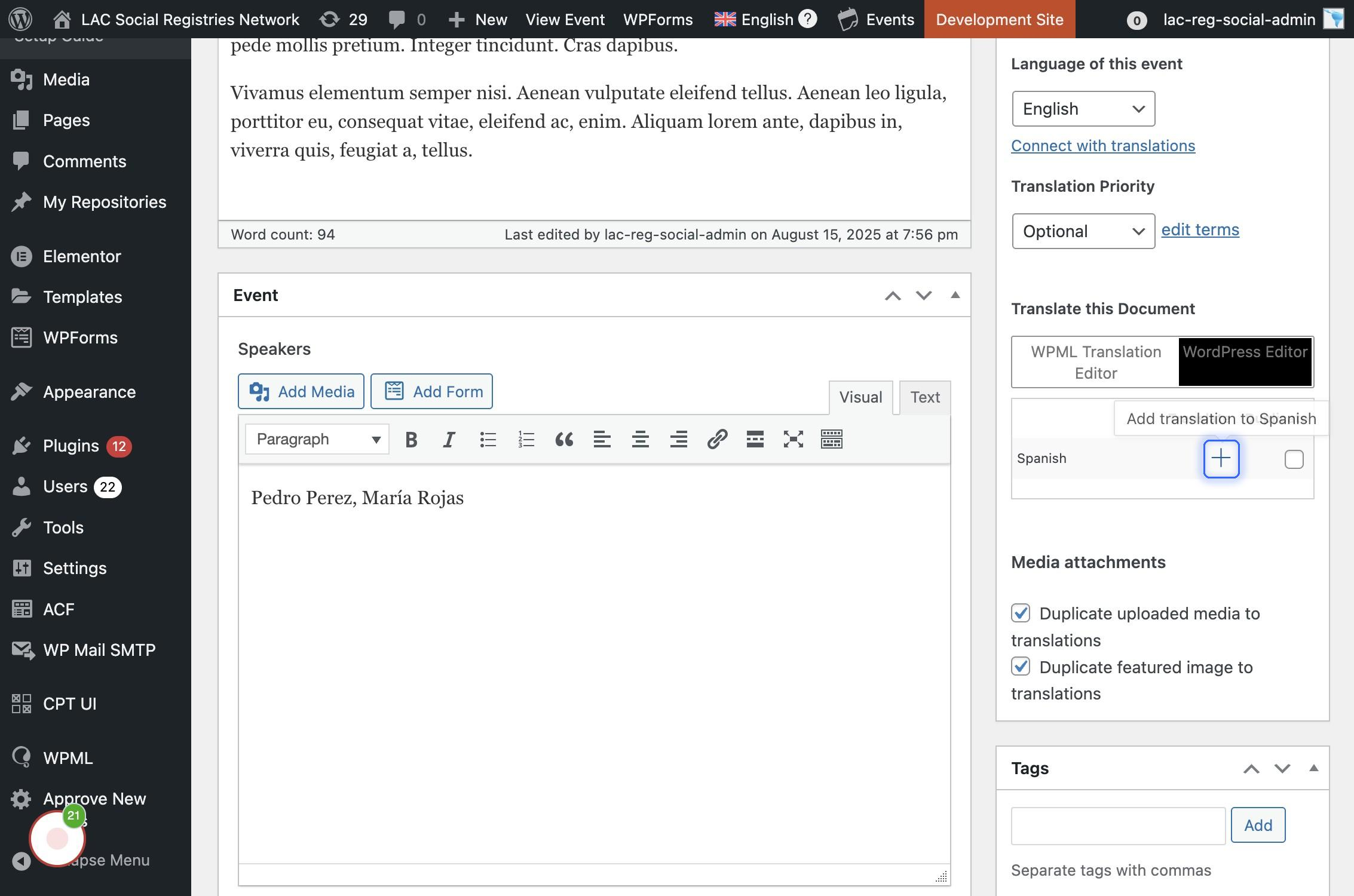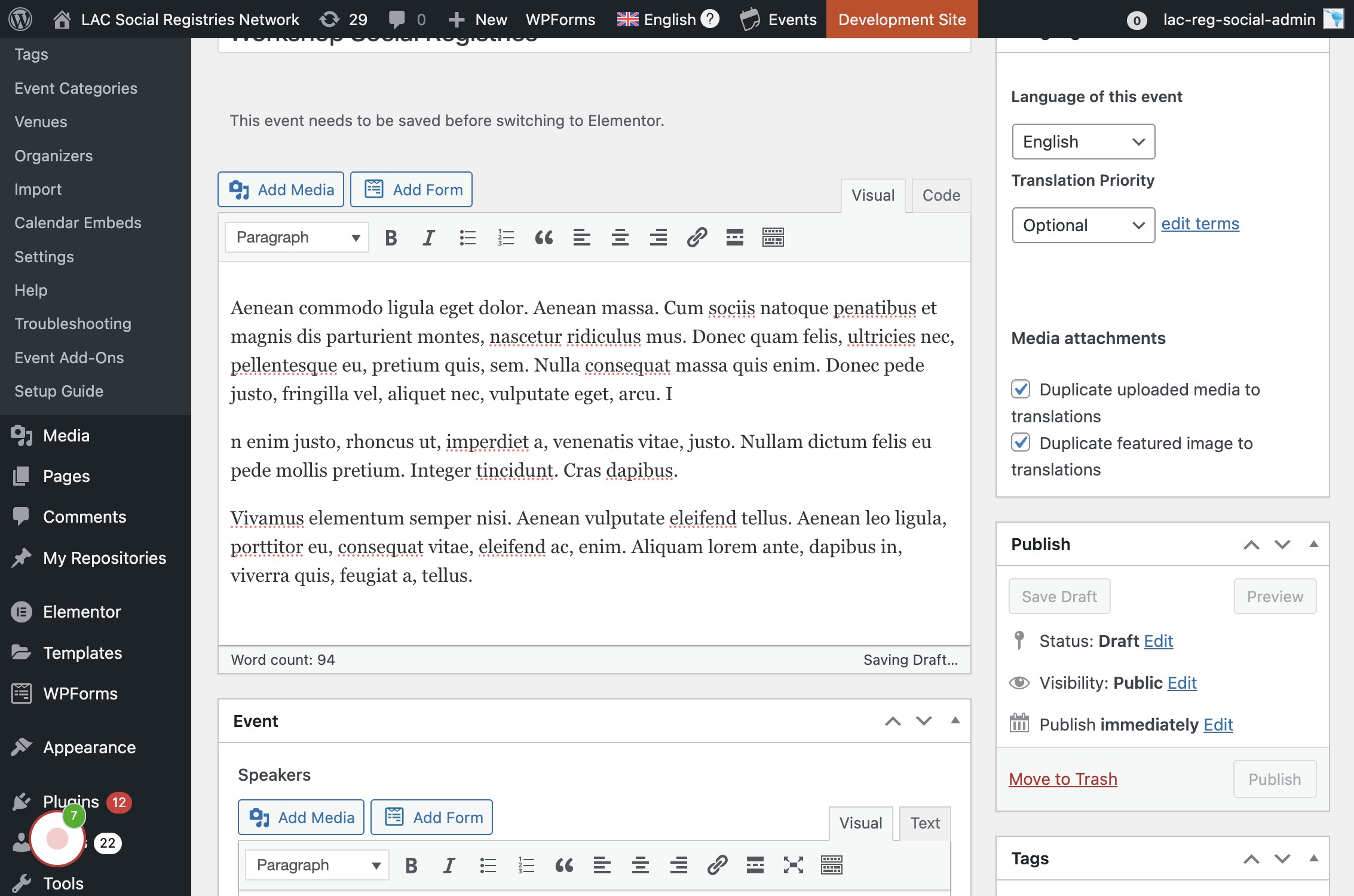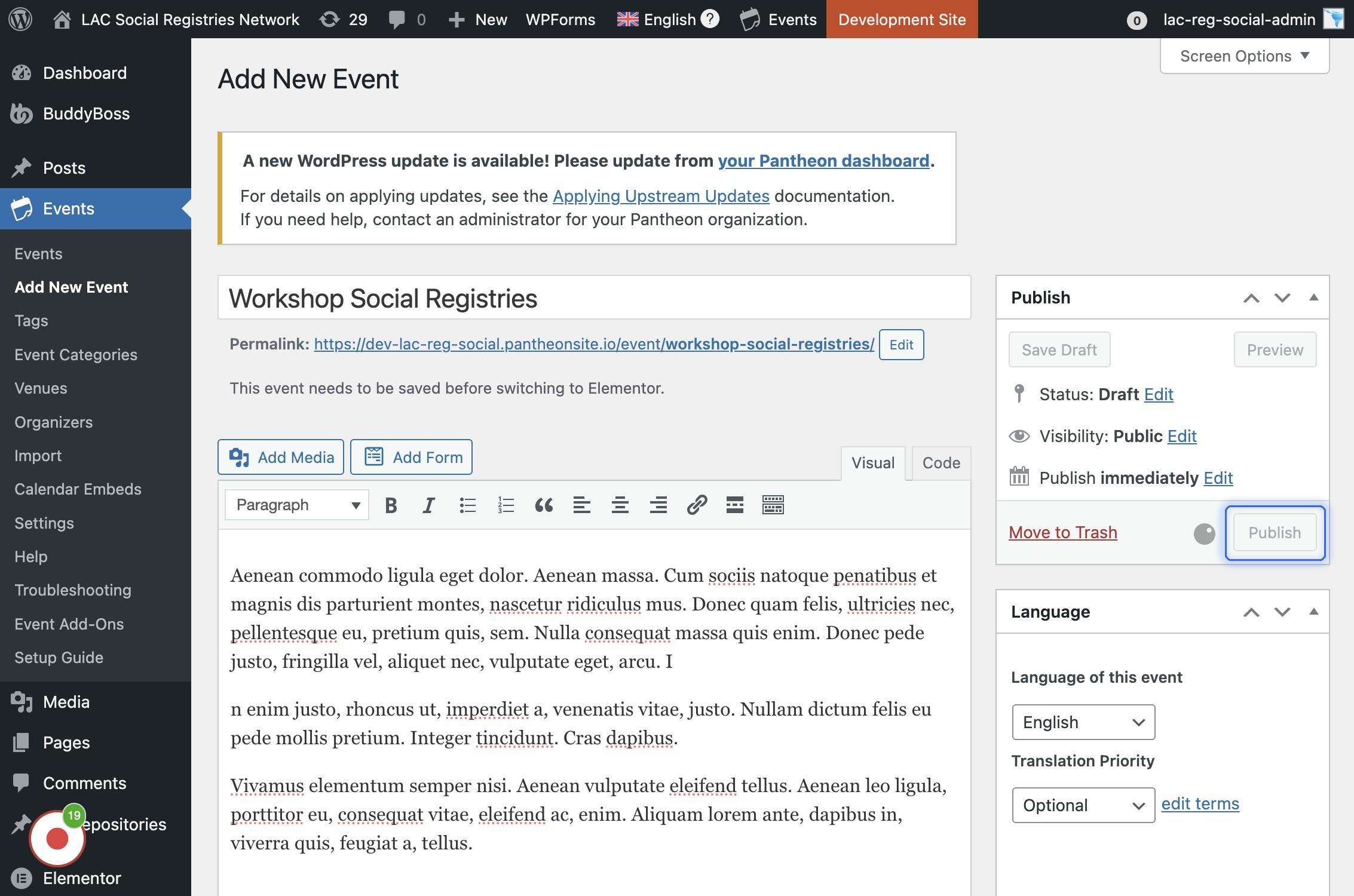 Si se encuentra navegando en la versión en inglés (arriba se visualiza la bandera británica y dice "English") Agregar el título del evento en inglés inicialmente, luego se va a crear la traducción.