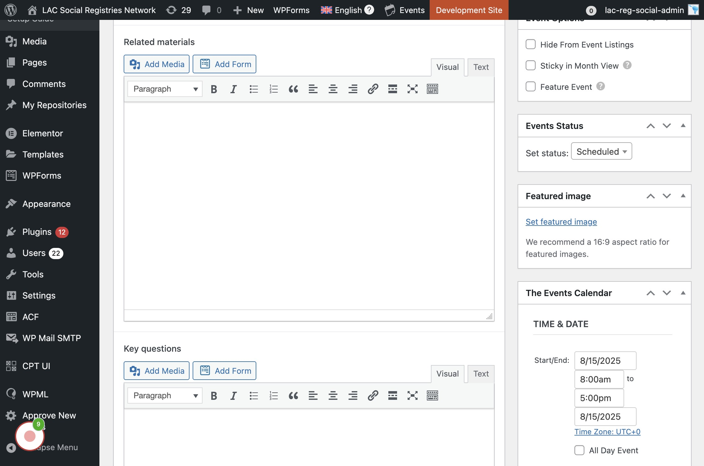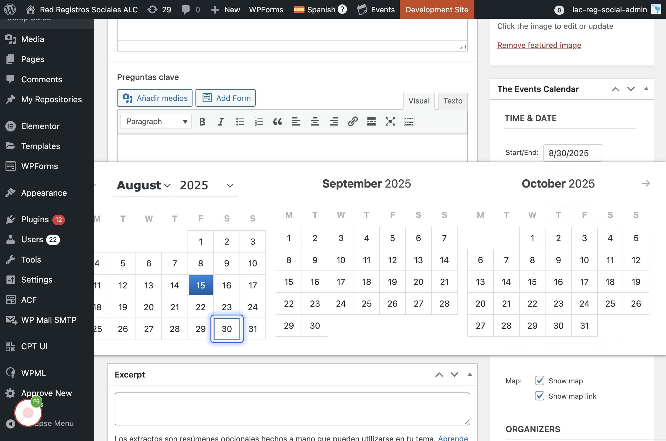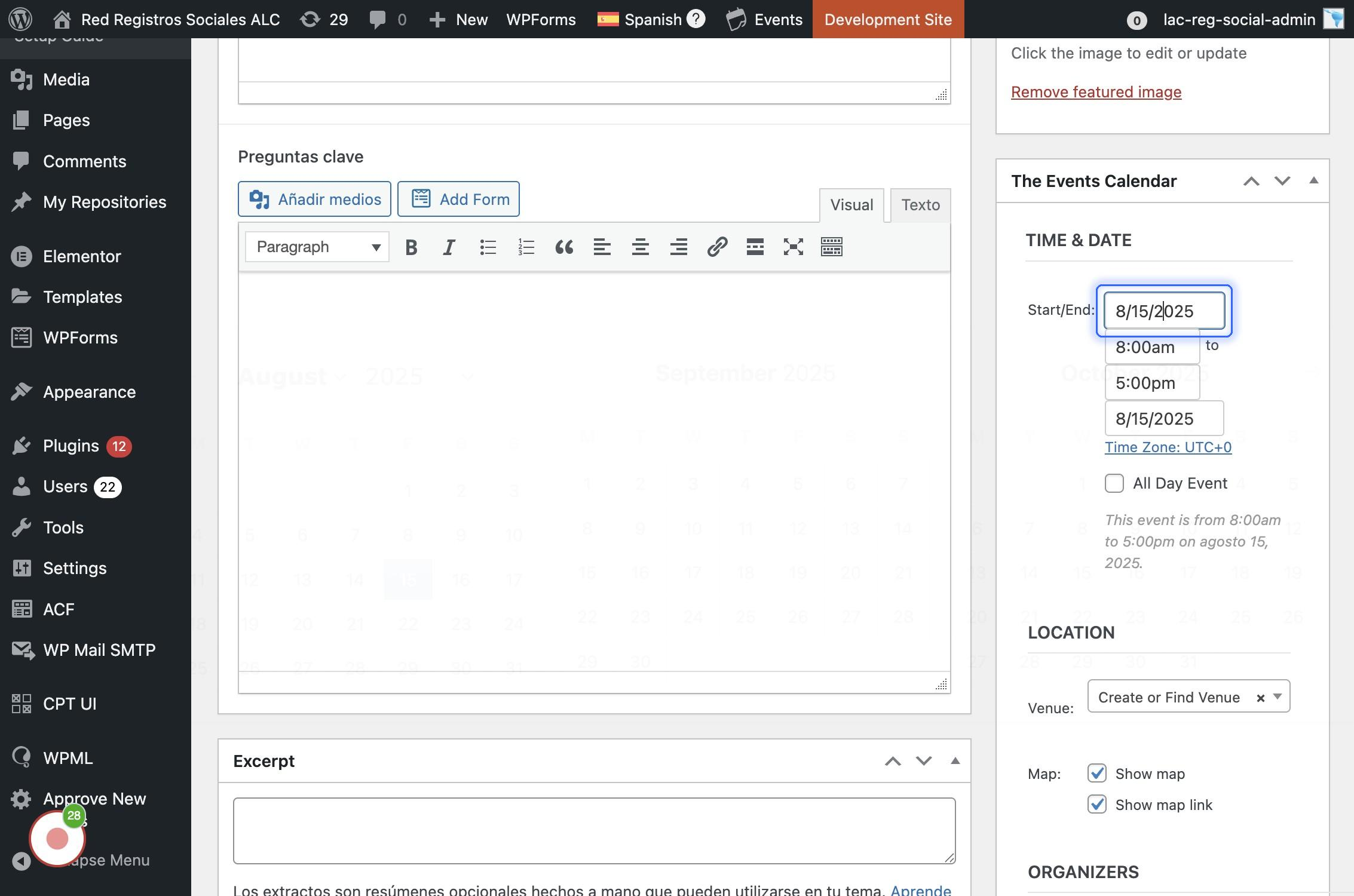 En la barra lateral derecha se ubica "Featured image" para establecer la imagen destacada que es la que se muestra en el detalle del evento.