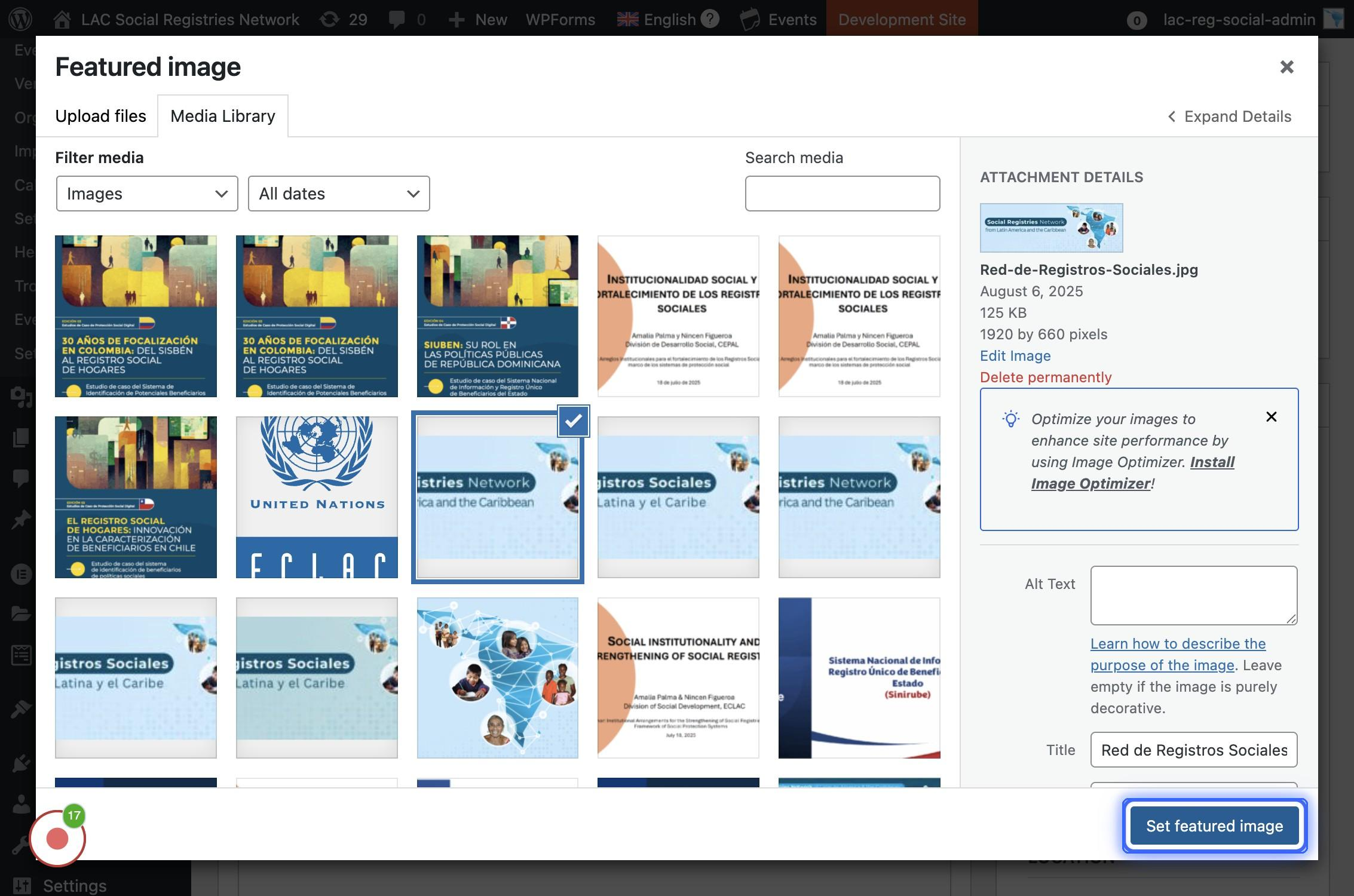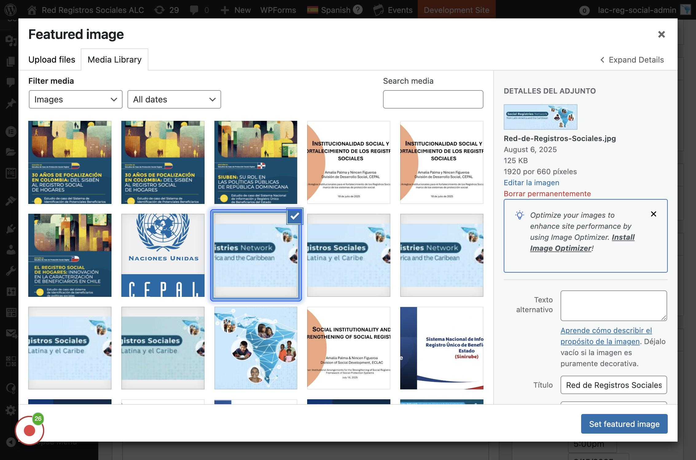 Se selecciona una imagen de las disponibles o se carga en caso de que no se haya cargado aún. Luego se hace click en "Set featured image"
