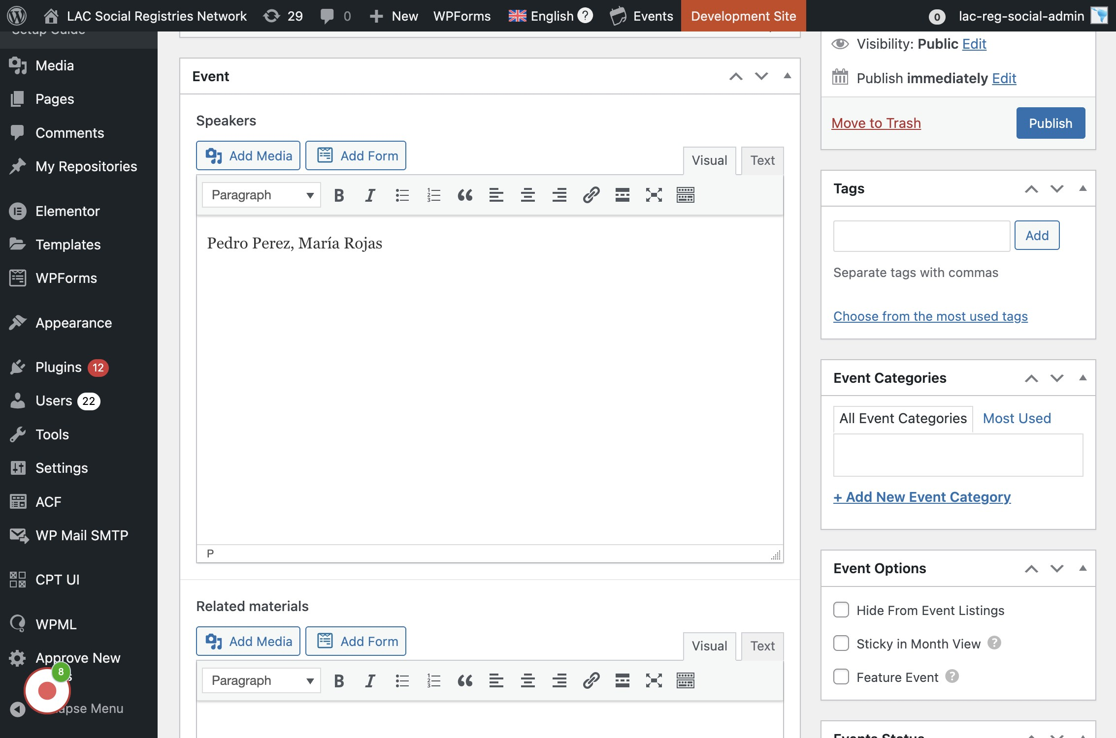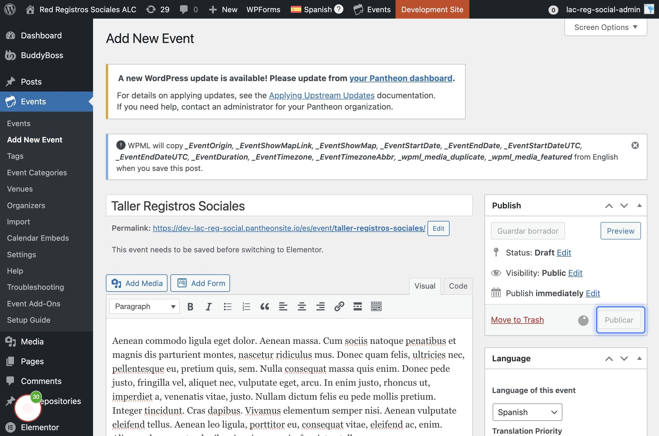 Se publica el evento en español: Hacer click en el botón "Publicar"